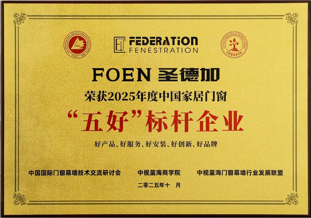De "Five Excellences" Benchmark Enterprise Selection is een zeer gezaghebbend evaluatiesysteem binnen de Chinese deuren- en ramenindustrie. Het voert een uitgebreide beoordeling van ondernemingen uit op vijf dimensies: "uitstekende producten, uitstekende service, uitstekende installatie, uitstekende innovatie en uitstekend merk." De erkenning van FOEN Shengdejia als "Five Excellences" Benchmark Enterprise weerspiegelt de volledige erkenning van experts uit de branche en consumenten voor onze producten en diensten.